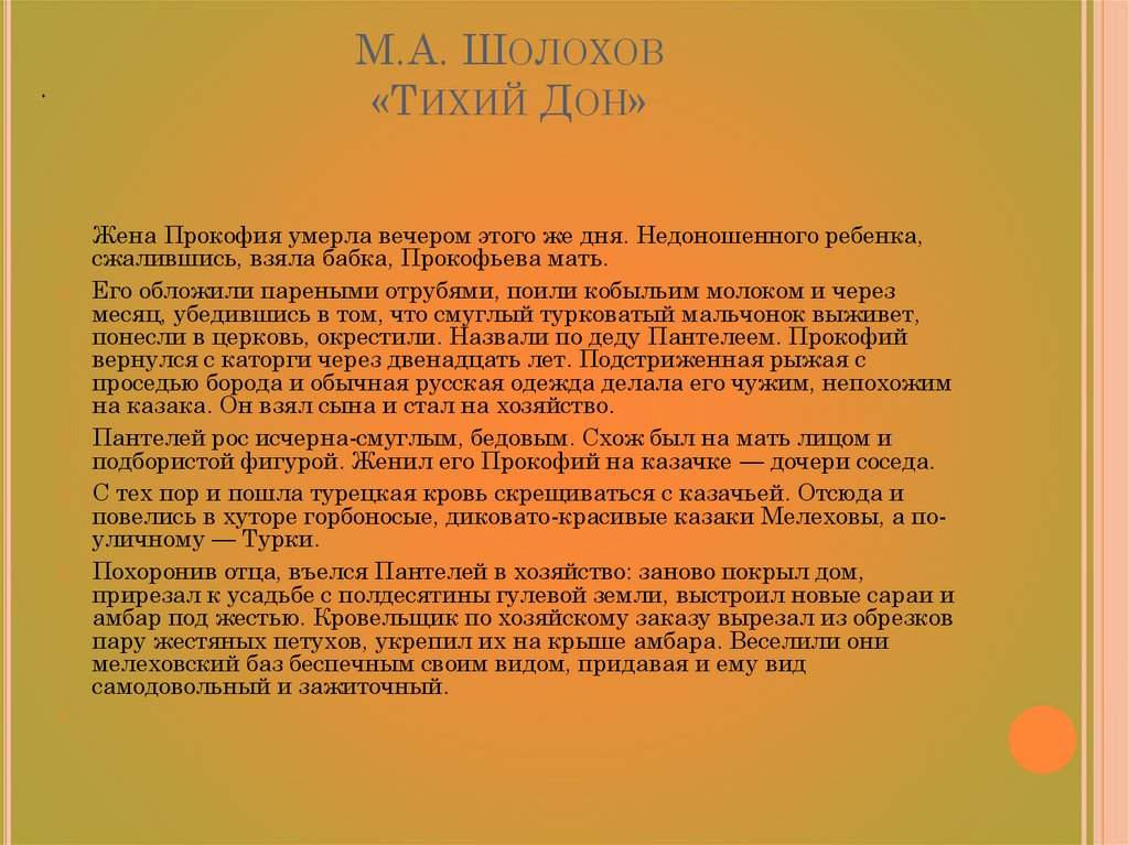 повелись в хуторе горбоносые, диковато-красивые казаки Мелеховы, а поуличному — Турки.