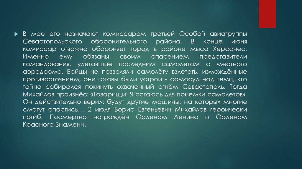 Михайлов произнёс: «Товарищи! Я остаюсь для приемки самолетов».