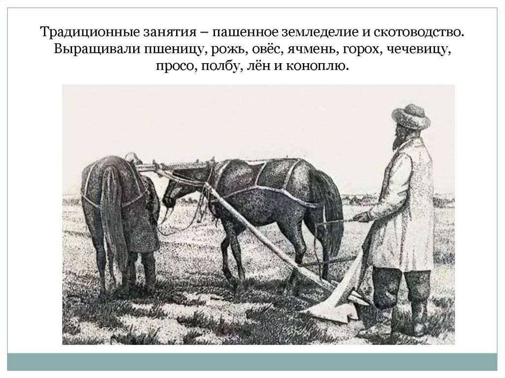 Традиционные занятия – пашенное земледелие и скотоводство.Выращивали пшеницу, рожь, овёс, ячмень, горох, чечевицу,