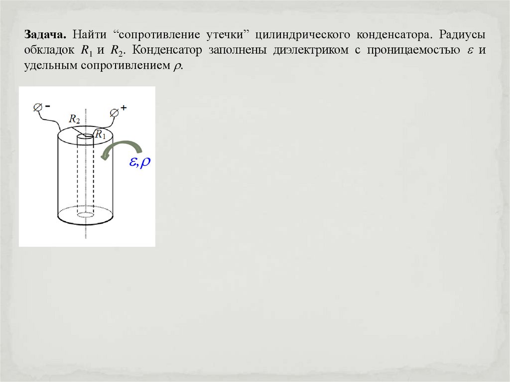 Задача. Найти “сопротивление утечки” цилиндрического конденсатора. Радиусыобкладок R1 и R2. Конденсатор заполнены диэлектриком с проницаемостью и