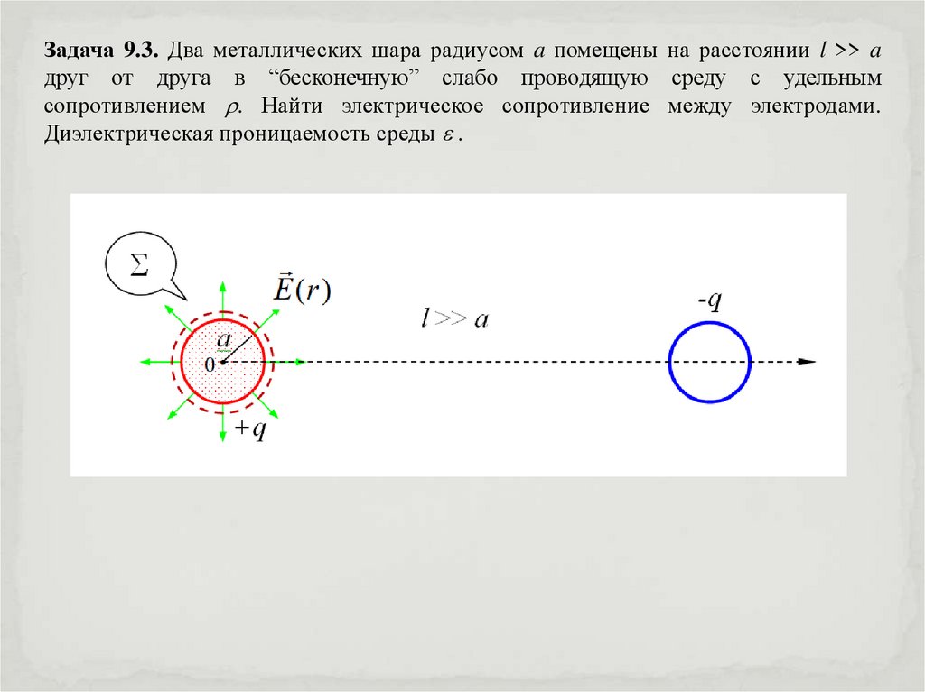 Задача 9.3. Два металлических шара радиусом a помещены на расстоянии l >> aдруг от друга в “бесконечную” слабо проводящую среду с удельным