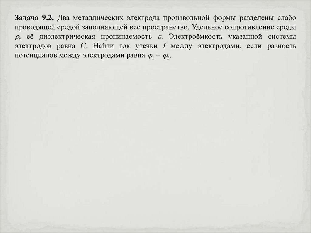 Задача 9.2. Два металлических электрода произвольной формы разделены слабопроводящей средой заполняющей все пространство. Удельное сопротивление среды