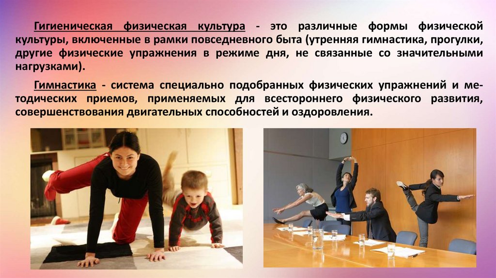 Гигиеническая физическая культура - это различные формы физическойкультуры, включенные в рамки повседневного быта (утренняя гимнастика, прогулки,
