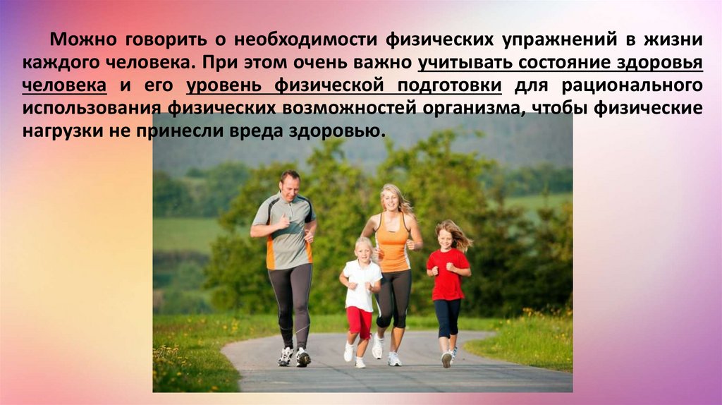 Можно говорить о необходимости физических упражнений в жизникаждого человека. При этом очень важно учитывать состояние здоровья