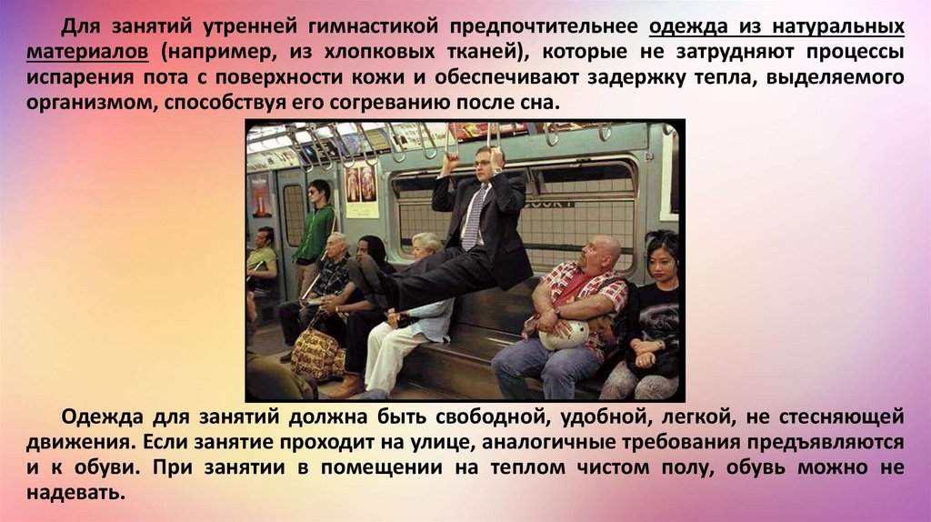 Для занятий утренней гимнастикой предпочтительнее одежда из натуральныхматериалов (например, из хлопковых тканей), которые не затрудняют процессы