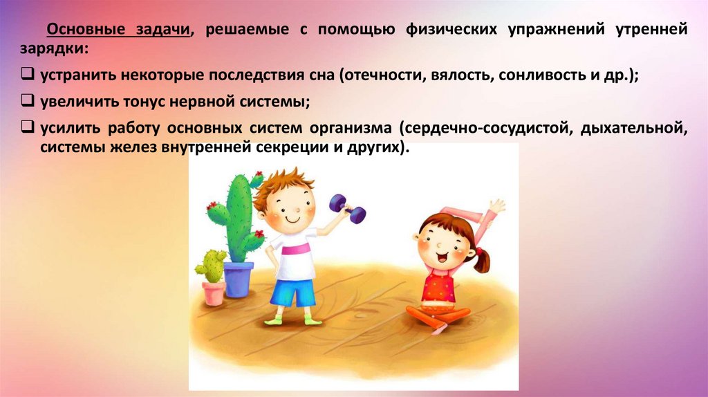 Основные задачи, решаемые с помощью физических упражнений утреннейзарядки: