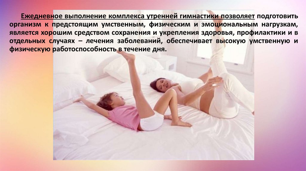 Ежедневное выполнение комплекса утренней гимнастики позволяет подготовитьорганизм к предстоящим умственным, физическим и эмоциональным нагрузкам,