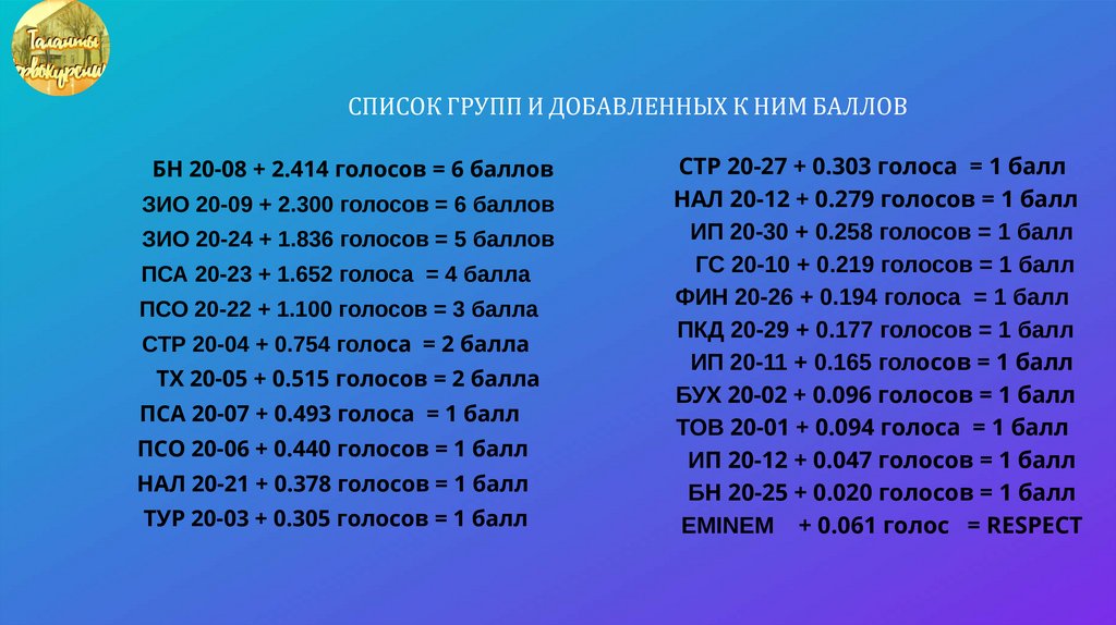 СПИСОК ГРУПП И ДОБАВЛЕННЫХ К НИМ БАЛЛОВБН 20-08 + 2.414 голосов = 6 баллов