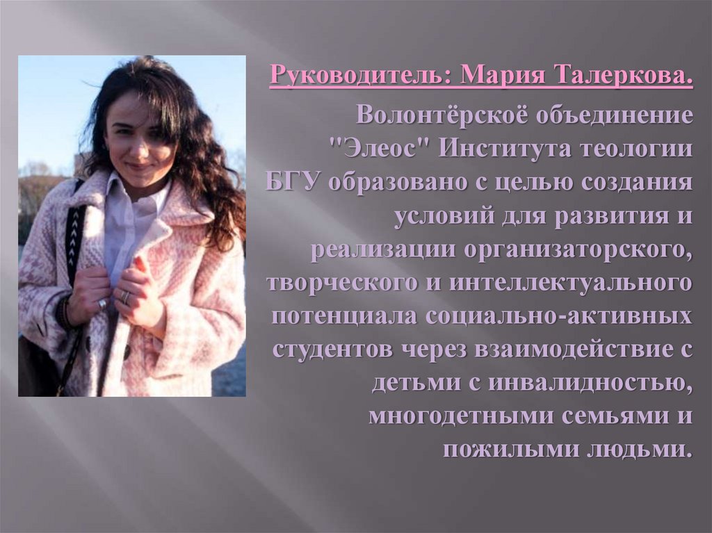 Руководитель: Мария Талеркова.Волонтёрскоё объединение