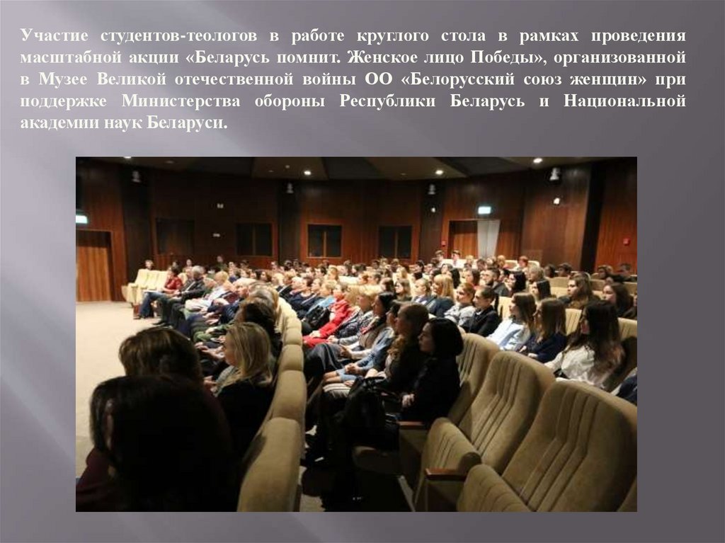 Участие студентов-теологов в работе круглого стола в рамках проведениямасштабной акции «Беларусь помнит. Женское лицо Победы», организованной