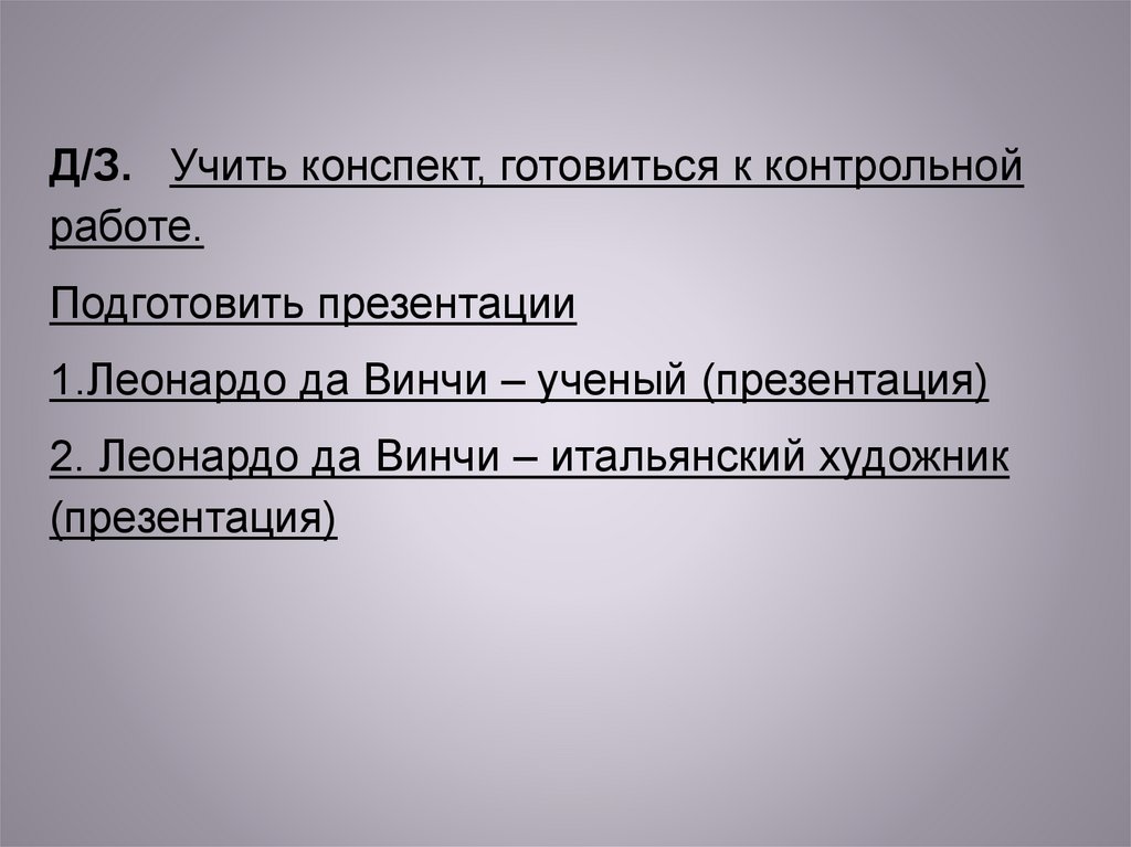 Д/З. Учить конспект, готовиться к контрольнойработе.