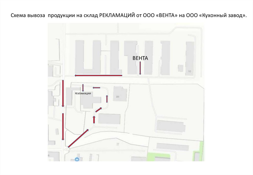 Схема вывоза продукции на склад РЕКЛАМАЦИЙ от ООО «ВЕНТА» на ООО «Кухонный завод».