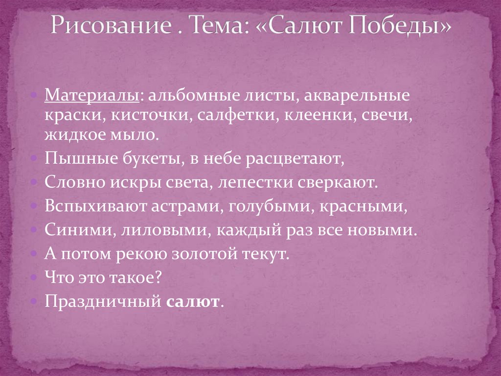 Материалы: альбомные листы, акварельныекраски, кисточки, салфетки, клеенки, свечи,