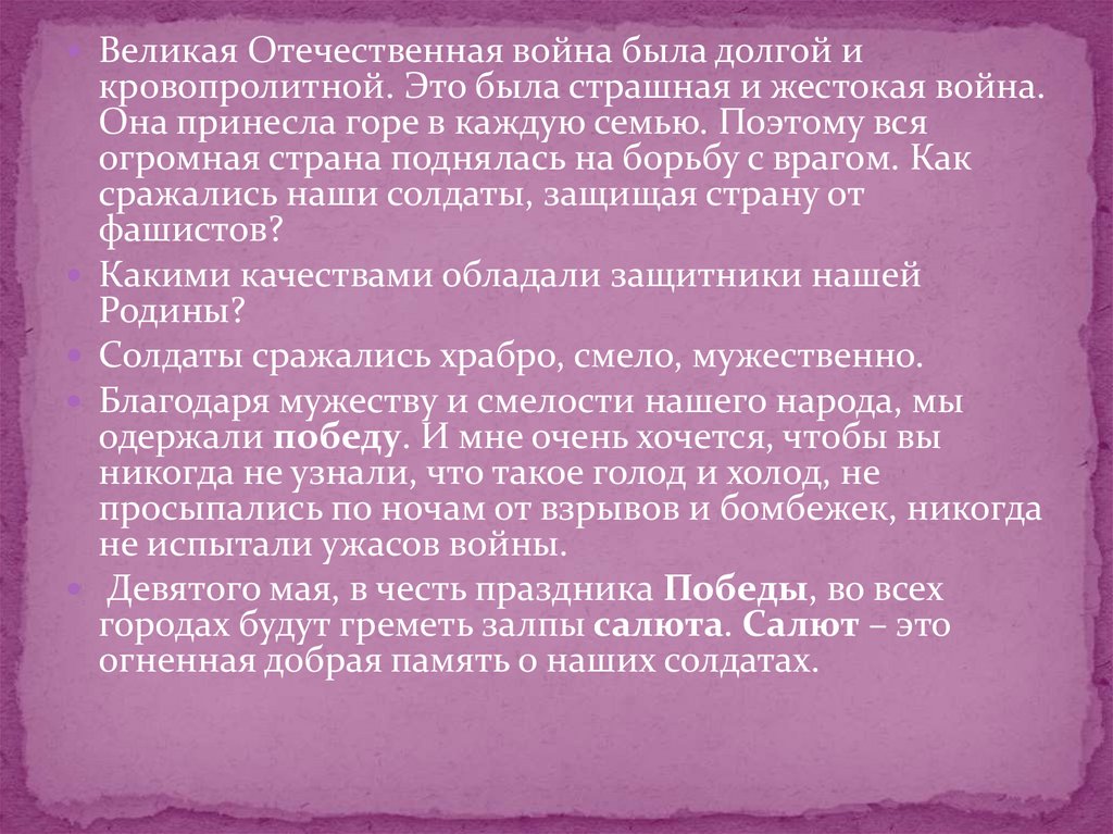Великая Отечественная война была долгой икровопролитной. Это была страшная и жестокая война.
