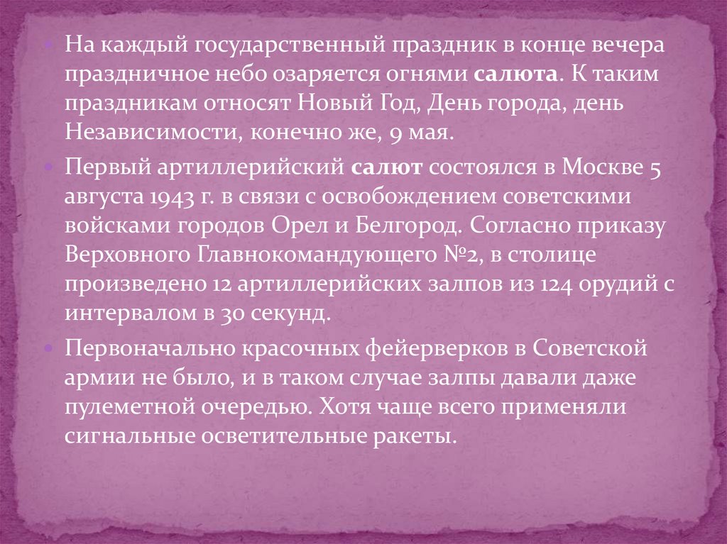 На каждый государственный праздник в конце вечерапраздничное небо озаряется огнями салюта. К таким