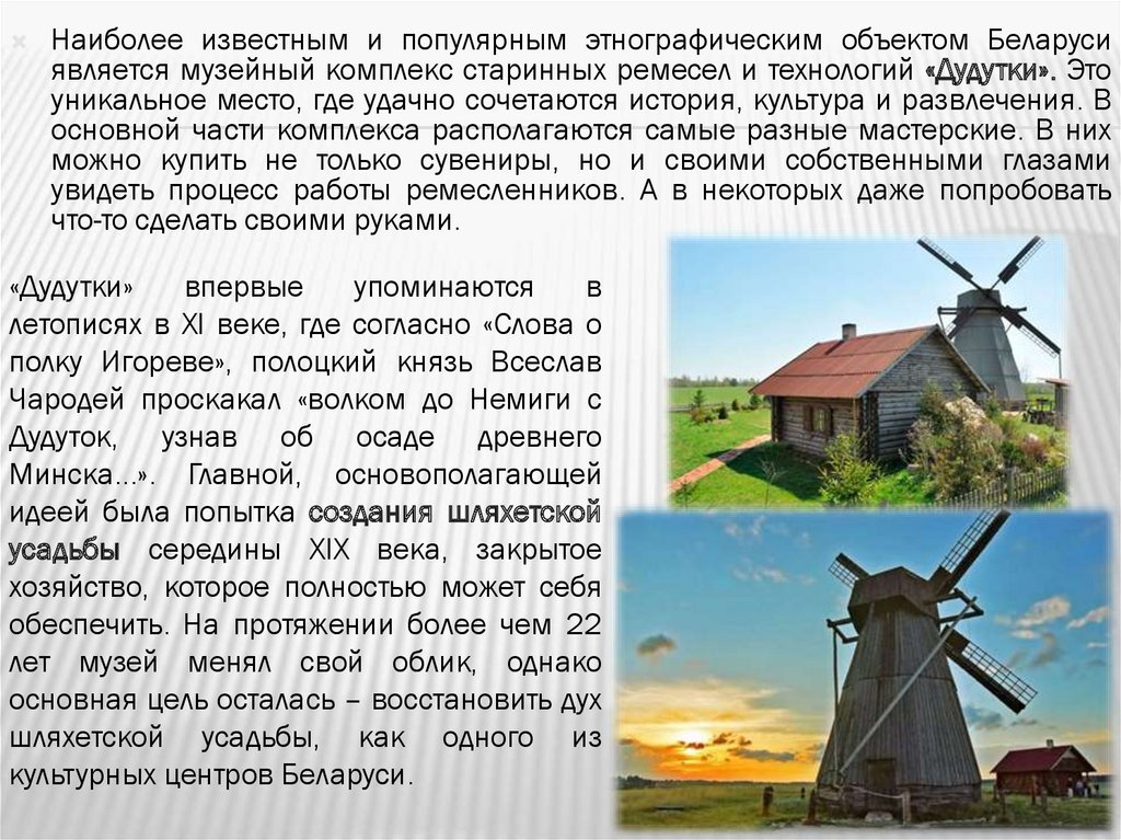 Наиболее известным и популярным этнографическим объектом Беларусиявляется музейный комплекс старинных ремесел и технологий «Дудутки». Это