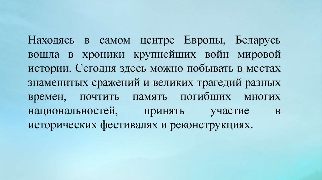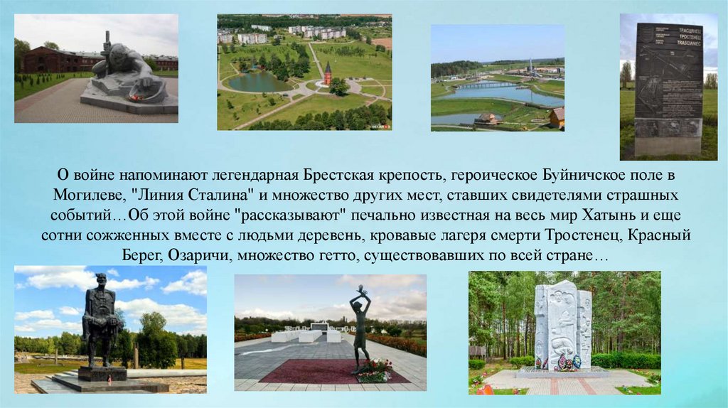 О войне напоминают легендарная Брестская крепость, героическое Буйничское поле вМогилеве, "Линия Сталина" и множество других мест, ставших свидетелями страшных