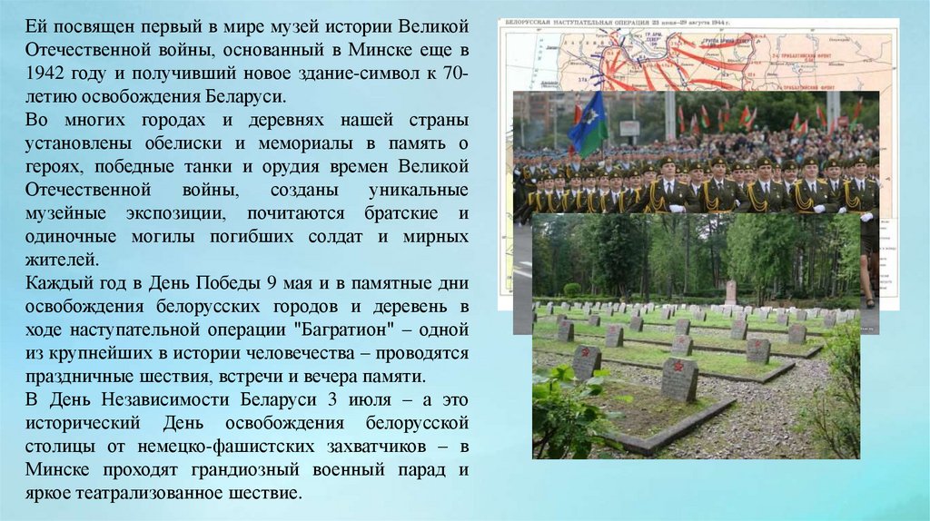 Ей посвящен первый в мире музей истории ВеликойОтечественной войны, основанный в Минске еще в