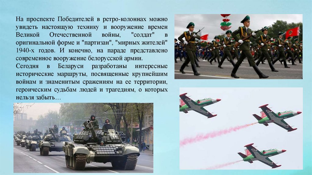 На проспекте Победителей в ретро-колоннах можноувидеть настоящую технику и вооружение времен
