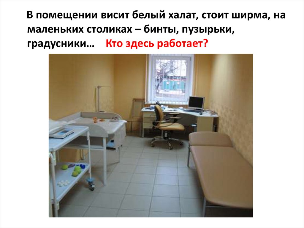 В помещении висит белый халат, стоит ширма, намаленьких столиках – бинты, пузырьки,