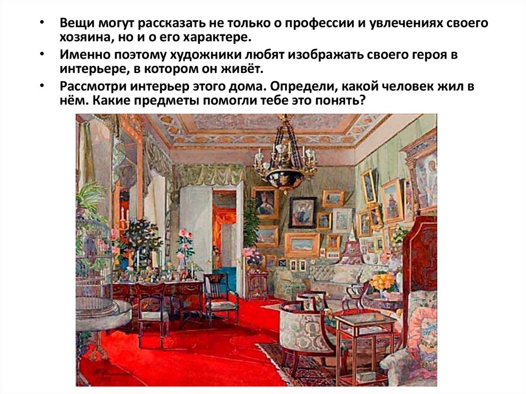 • Рассмотри интерьер этого дома. Определи, какой человек жил в