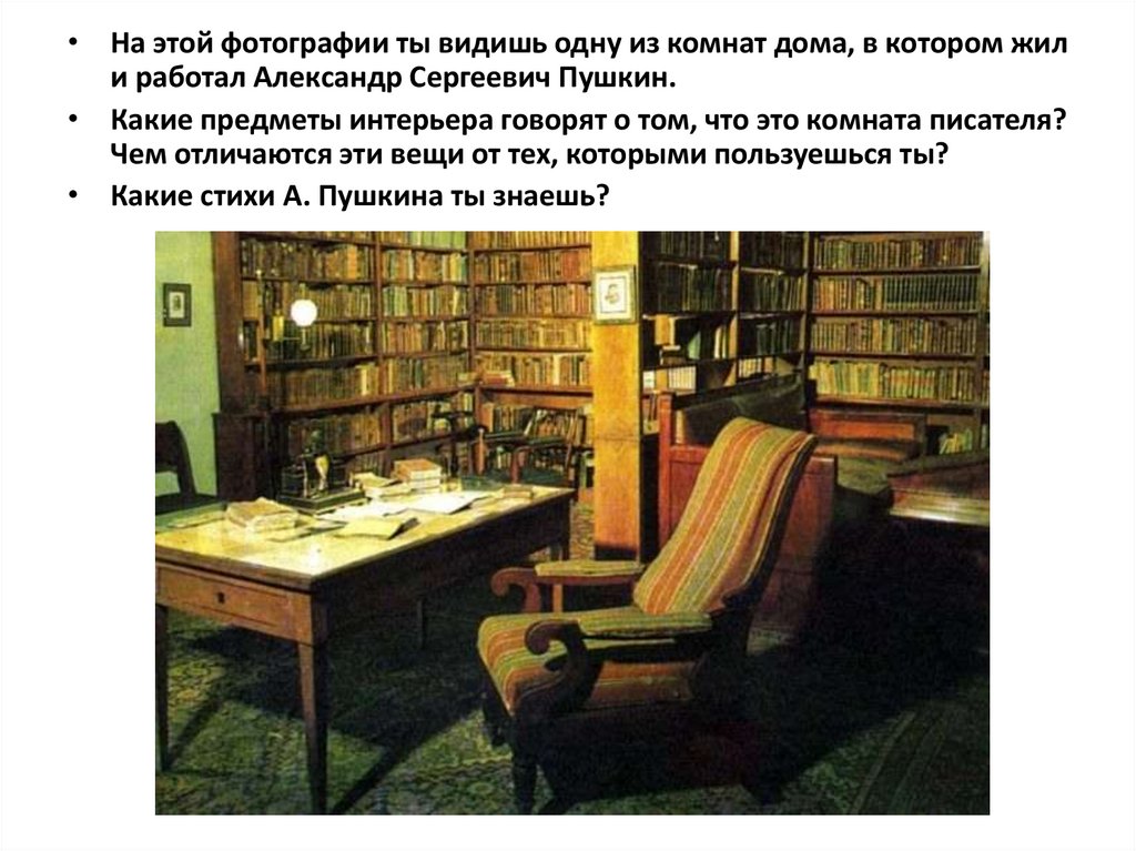 • На этой фотографии ты видишь одну из комнат дома, в котором жили работал Александр Сергеевич Пушкин.
