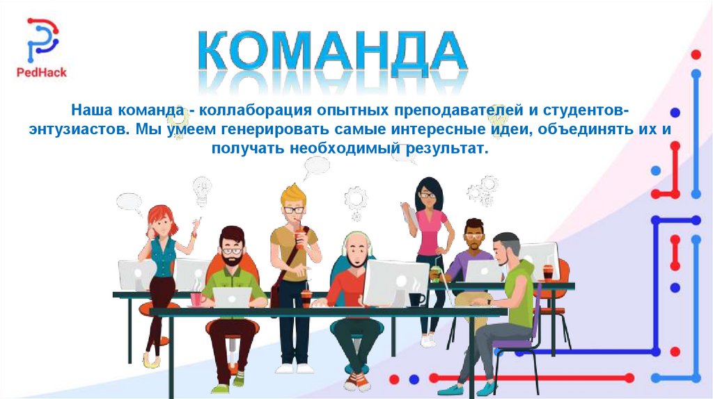 Наша команда - коллаборация опытных преподавателей и студентовэнтузиастов. Мы умеем генерировать самые интересные идеи, объединять их иполучать необходимый результат.