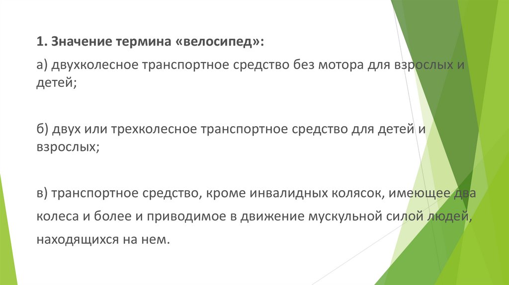 1. Значение термина «велосипед»:а) двухколесное транспортное средство без мотора для взрослых и