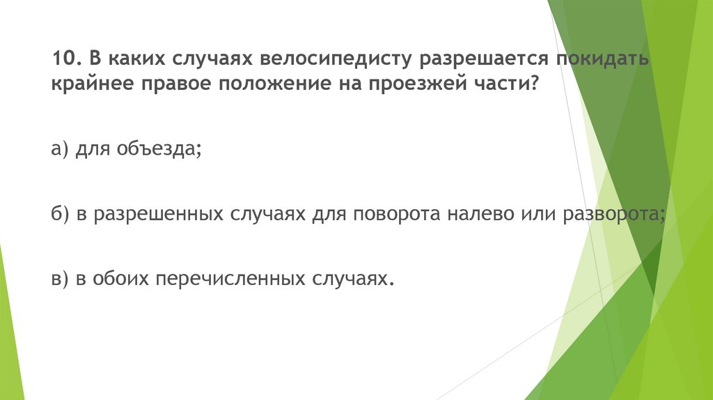 10. В каких случаях велосипедисту разрешается покидатькрайнее правое положение на проезжей части?
