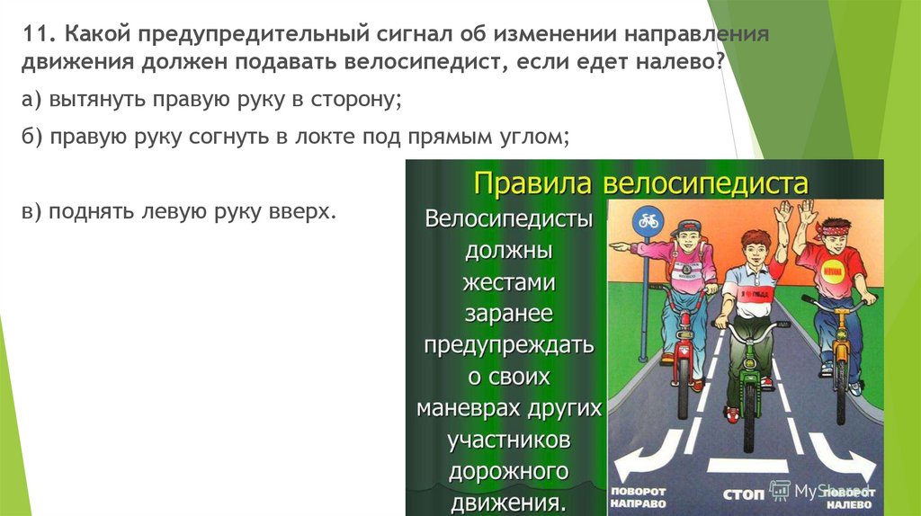 11. Какой предупредительный сигнал об изменении направлениядвижения должен подавать велосипедист, если едет налево?