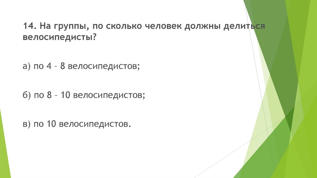 14. На группы, по сколько человек должны делитьсявелосипедисты?