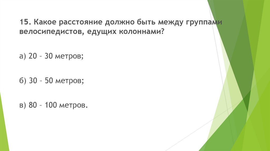 15. Какое расстояние должно быть между группамивелосипедистов, едущих колоннами?