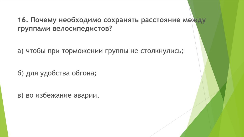 16. Почему необходимо сохранять расстояние междугруппами велосипедистов?