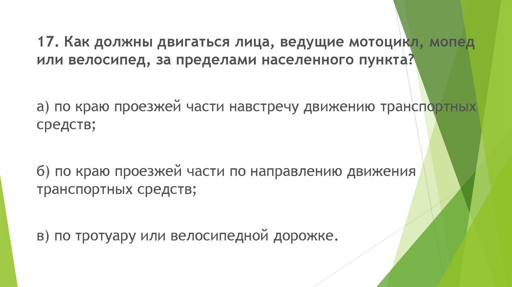 17. Как должны двигаться лица, ведущие мотоцикл, мопедили велосипед, за пределами населенного пункта?