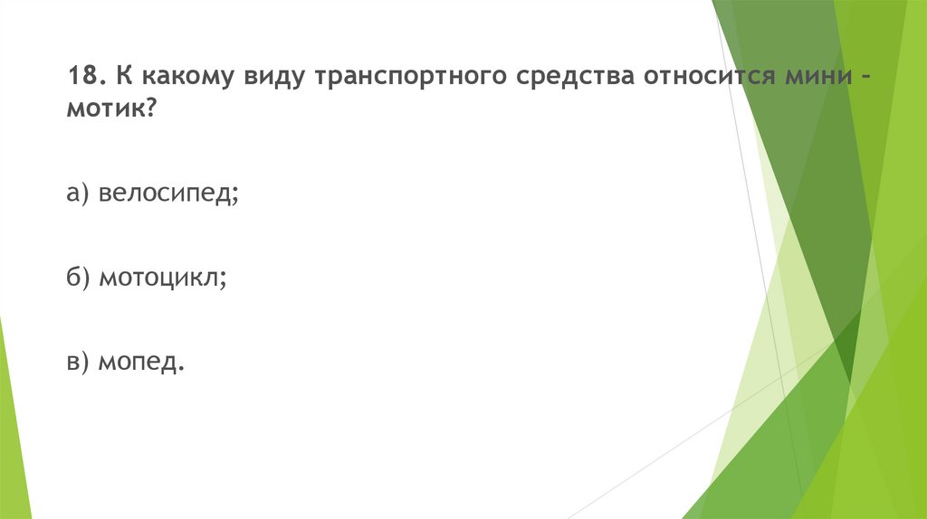 18. К какому виду транспортного средства относится мини –мотик?