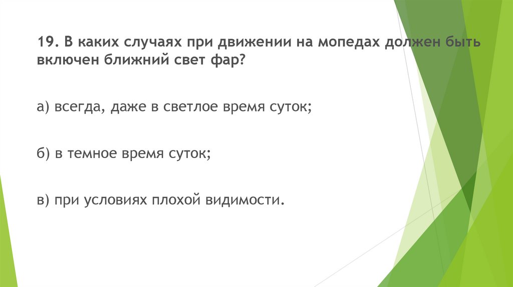 19. В каких случаях при движении на мопедах должен бытьвключен ближний свет фар?