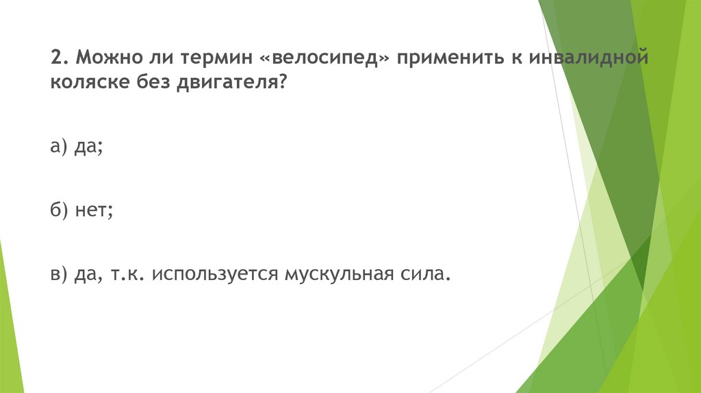 2. Можно ли термин «велосипед» применить к инвалиднойколяске без двигателя?