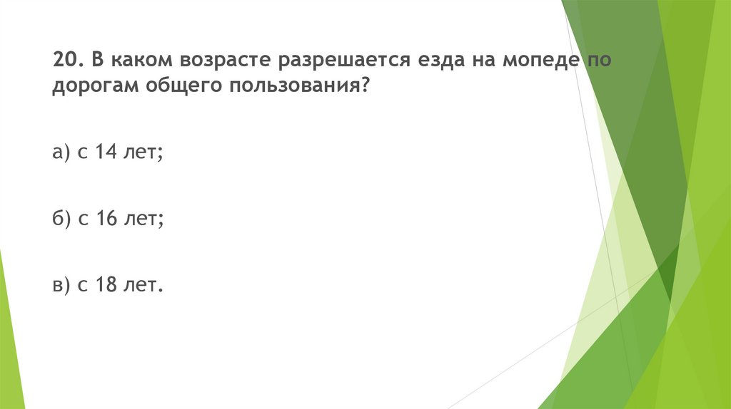 20. В каком возрасте разрешается езда на мопеде подорогам общего пользования?