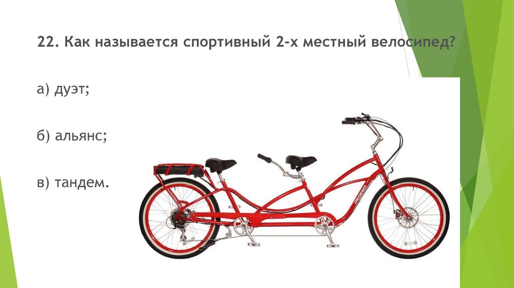 22. Как называется спортивный 2-х местный велосипед?а) дуэт;