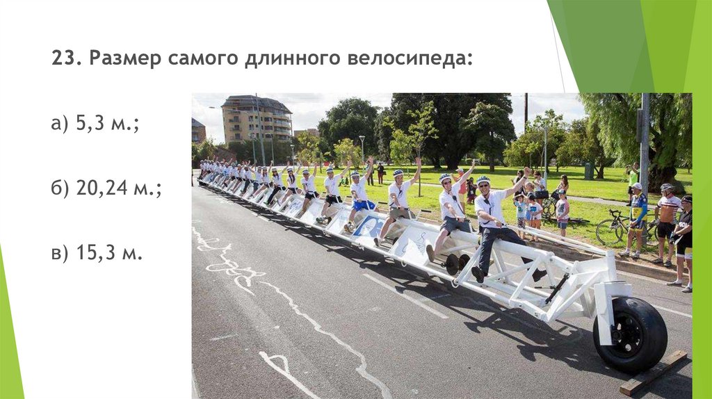 23. Размер самого длинного велосипеда:а) 5,3 м.;