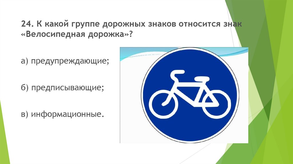24. К какой группе дорожных знаков относится знак«Велосипедная дорожка»?