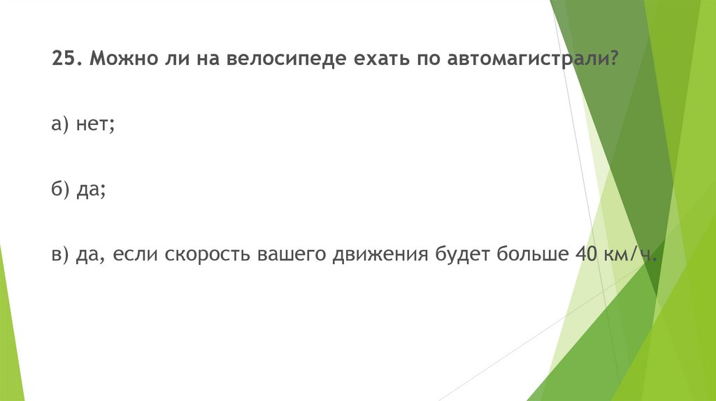 25. Можно ли на велосипеде ехать по автомагистрали?а) нет;