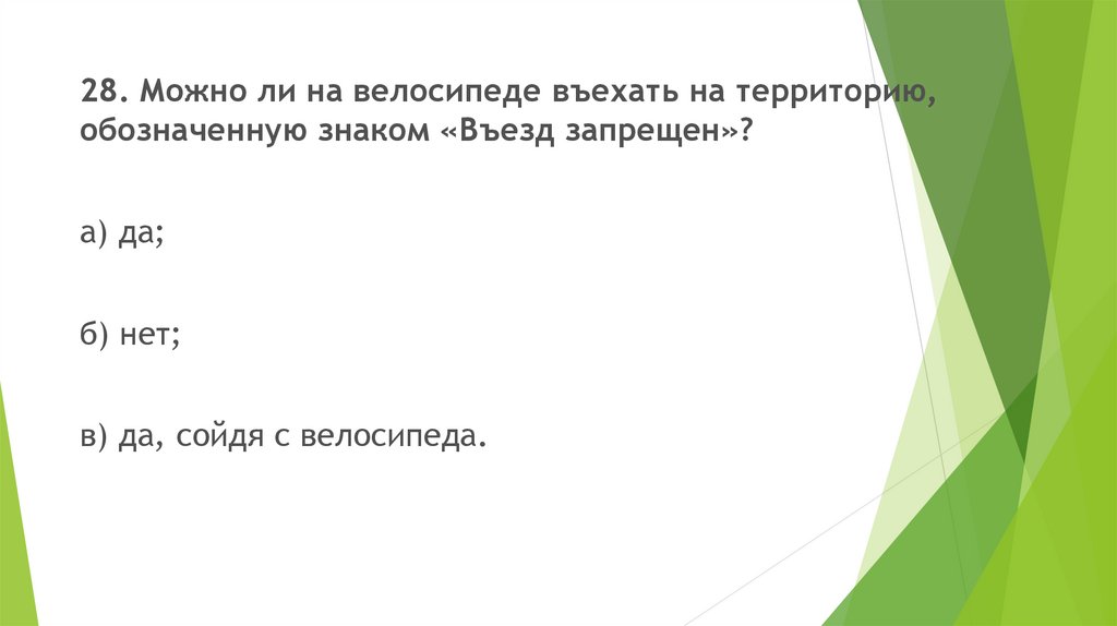 28. Можно ли на велосипеде въехать на территорию,обозначенную знаком «Въезд запрещен»?
