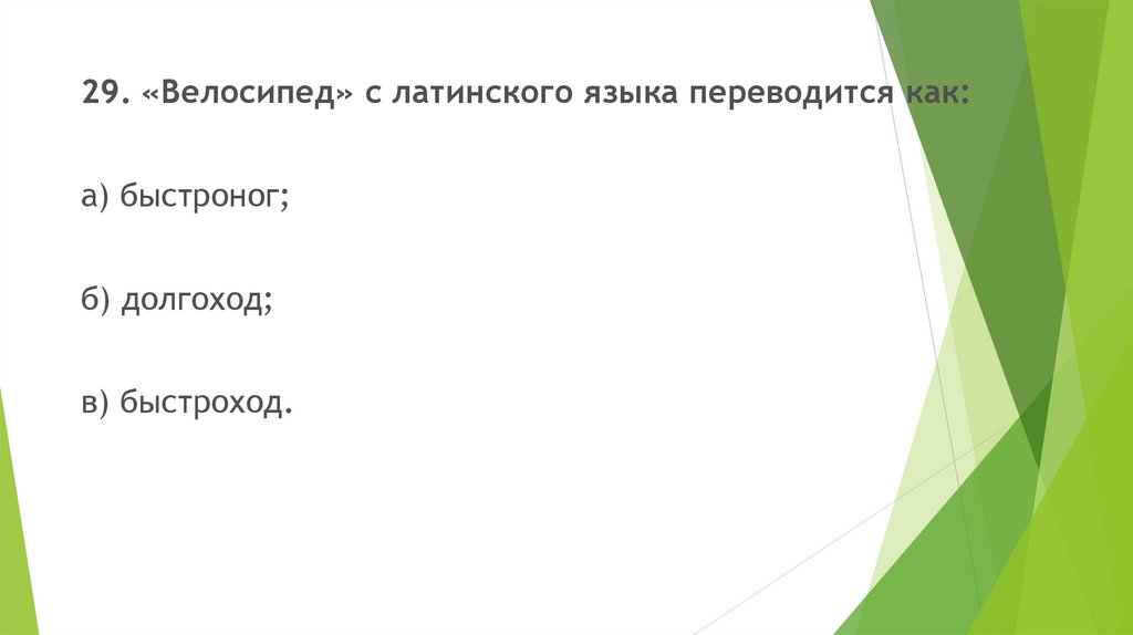 29. «Велосипед» с латинского языка переводится как:а) быстроног;