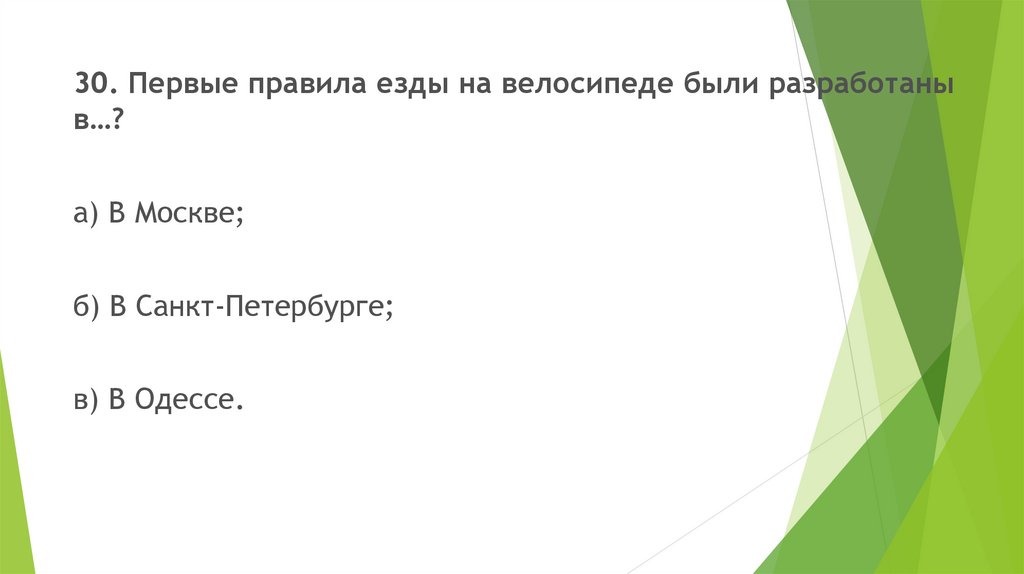 30. Первые правила езды на велосипеде были разработаныв…?