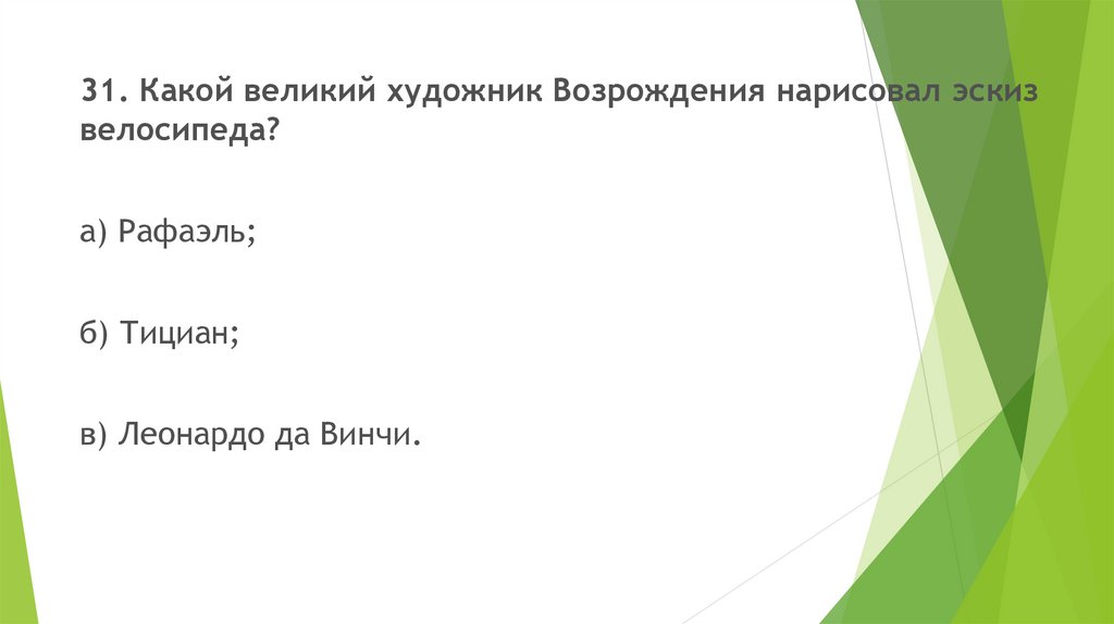 31. Какой великий художник Возрождения нарисовал эскизвелосипеда?