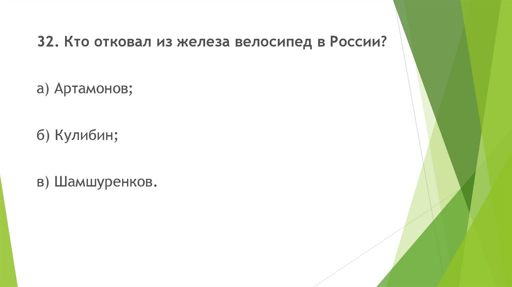 32. Кто отковал из железа велосипед в России?а) Артамонов;