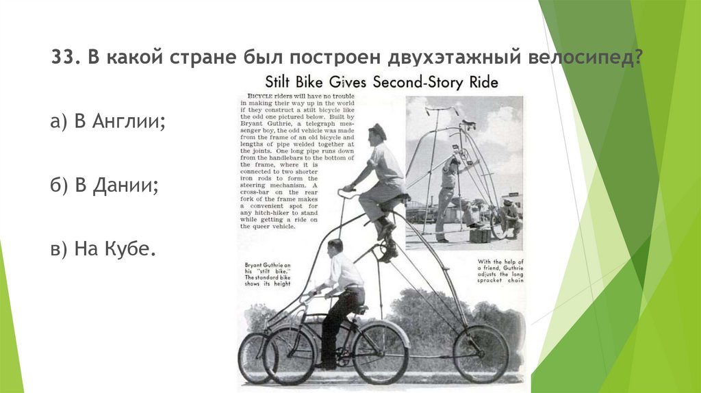 33. В какой стране был построен двухэтажный велосипед?а) В Англии;