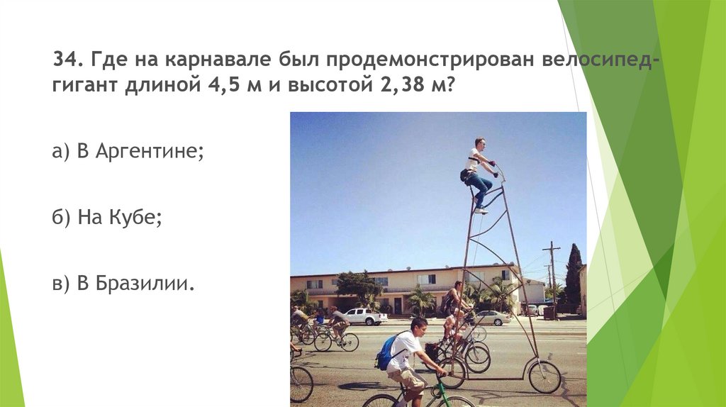 34. Где на карнавале был продемонстрирован велосипедгигант длиной 4,5 м и высотой 2,38 м?а) В Аргентине;