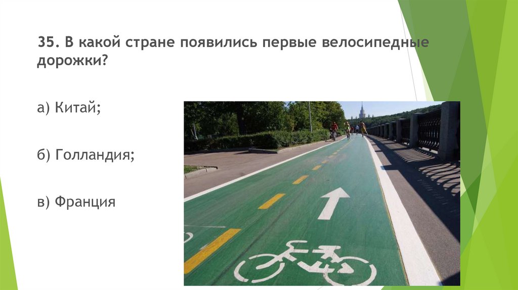 35. В какой стране появились первые велосипедныедорожки?